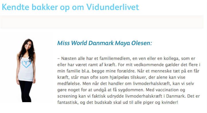 Maya kan nu glæde sig til et år som Miss World Denmark 2011, hvor hun bl.a. skal være med til at sætte fokus på livmoderhalskræft. Tidligere på året blev hun ambassadør for ”Vidunderlivet”, og skal nu være med til at fortælle unge kvinder om hvor vigtigt det er at beskytte sig mod livmoderhalskræft.