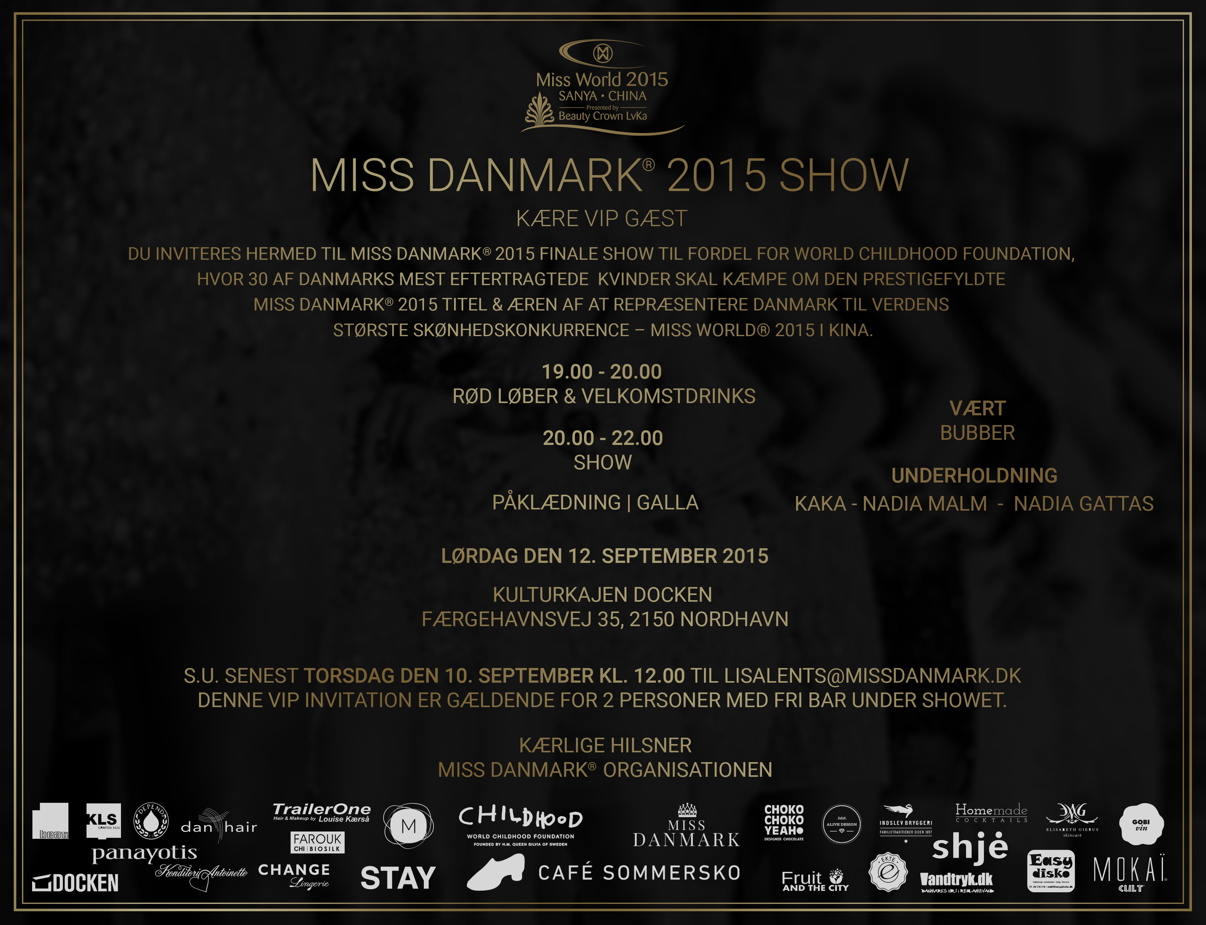 I INVITERES HERMED TIL MISS DANMARK® 2015 FINALE SHOW TIL FORDEL FOR WORLD CHILDHOOD FOUNDATION, HVOR 30 AF DANMARKS MEST EFTERTRAGTEDE KVINDER SKAL KÆMPE OM DEN PRESTIGEFYLDTE MISS DANMARK® 2015 TITEL & ÆREN AF AT REPRÆSENTERE DANMARK TIL VERDENS STØRSTE SKØNHEDSKONKURRENCE – MISS WORLD® 2015 I KINA.